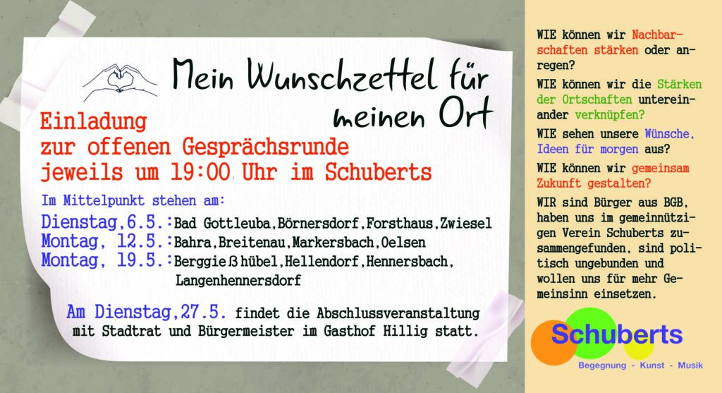 Im Mai haben wir vom Schuberts e.V. alle zwölf Ortsteile von Bad Gottleuba-Berggießhübel eingeladen, ins Gespräch zu kommen. Ziel war es, Menschen zusammenzubringen, einander zuzuhören und Ideen für die gemeinsame Zukunft unserer Ortsteile zu sammeln.